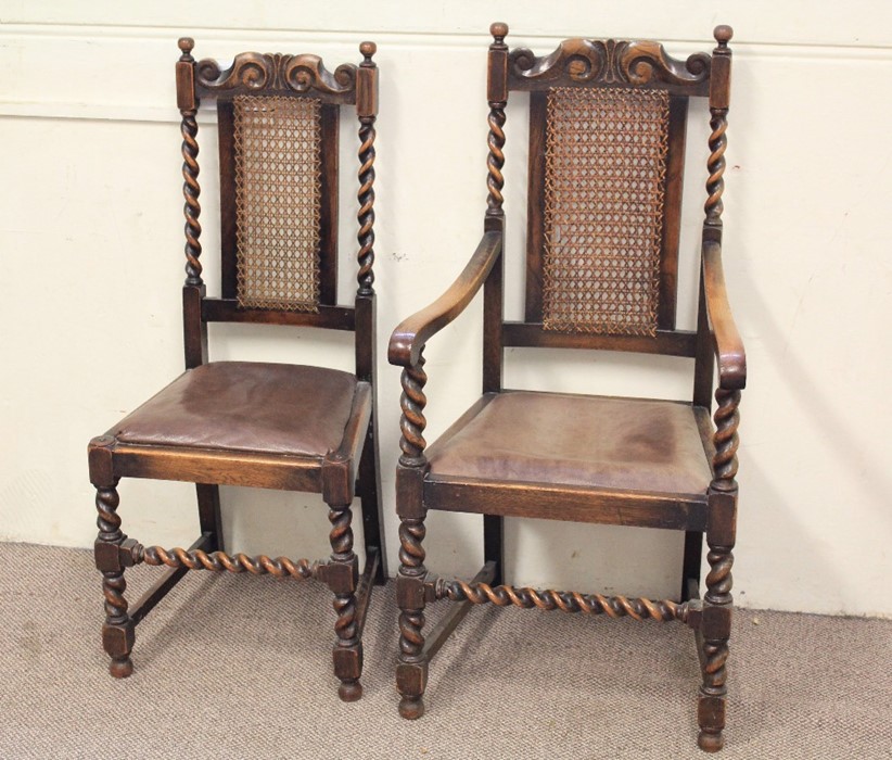 Set of Six Victorian Oak Dining Chairs. The chairs (one carver and five chairs) with woven cane b