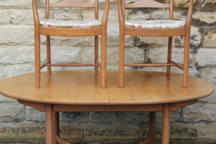 A Light Oak Ercol Oval Dining Table. The dining table with matching four chairs and two carvers,