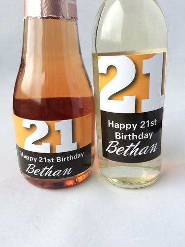 Birthday Confetti Personalized Mini Bottle Liquor Labels 15 Set of 12. $129.99. $90.99 ($6.07 ea.) Custom printed with any age, name and special message. Labels measure 2"H x 3.5"W and will fit the front of most standard 50ml mini liquor or champagne bottles; straight walled bottles are best. Label is self-adhesive and waterproof. Minor assembly required- just peel and stick to any mini liquor bottle.